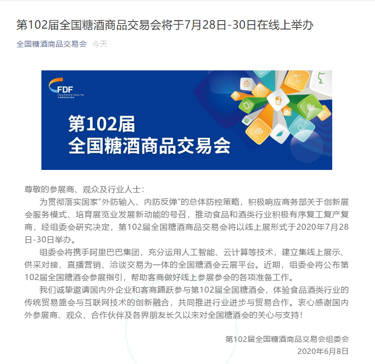 糖酒會設計搭建公司領藝展覽了解到,為貫徹落實國家“外防輸入、內防反彈”的總體防控策略,積極響應商務部關于創(chuàng)新展會服務模式、培育展覽業(yè)發(fā)展新動能的號召,推動食品和酒類行業(yè)積極有序復工復產復商,經組委會研究決定,第102屆全國糖酒商品交易會將以線上展形式于2020年7月28日-30日舉辦。如需展會設計請聯系領藝展覽,希望我們能在展會搭建上為您添磚加瓦,祝各位朋友收獲多多,滿載而歸!